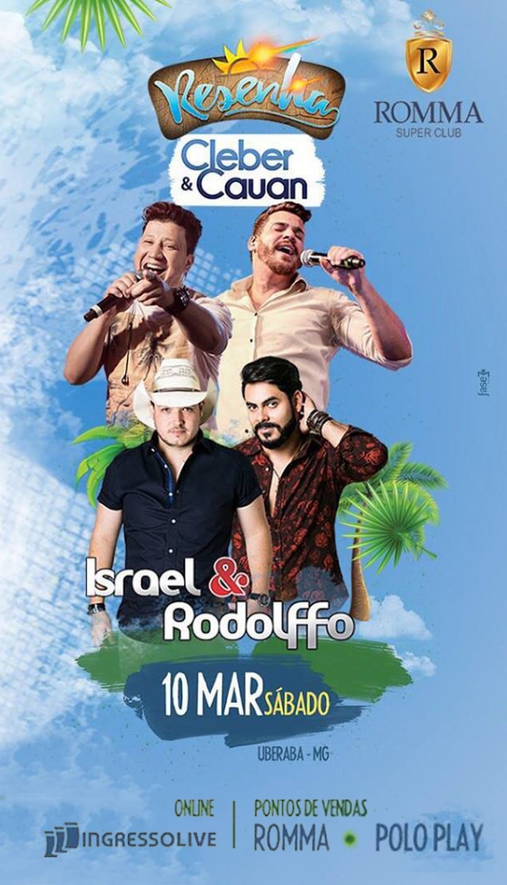 Um dos encontros mais sensacionais do ano. Cleber & Cauan e Israel & Rodolffo juntos no Romma Super Clube Dia 10 de março. Vendas Romma e Polo Play - Online: Ingresso Live