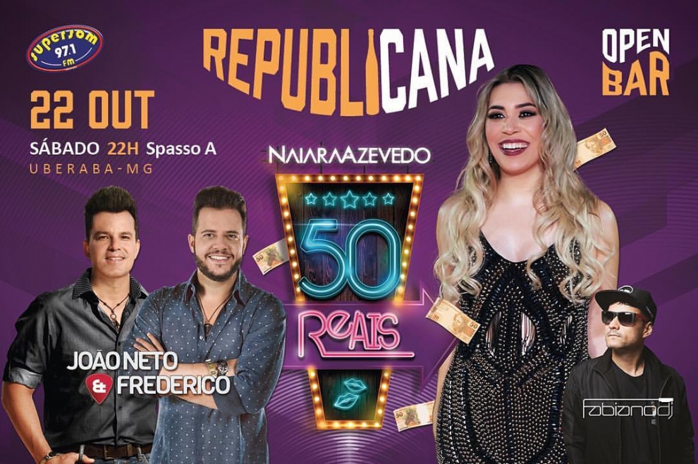 O fenômeno NAIARA AZEVEDO junto com JOÃO NETO & FREDERICO prometem agitar a turma no dia 22 de outubro no Spasso A.